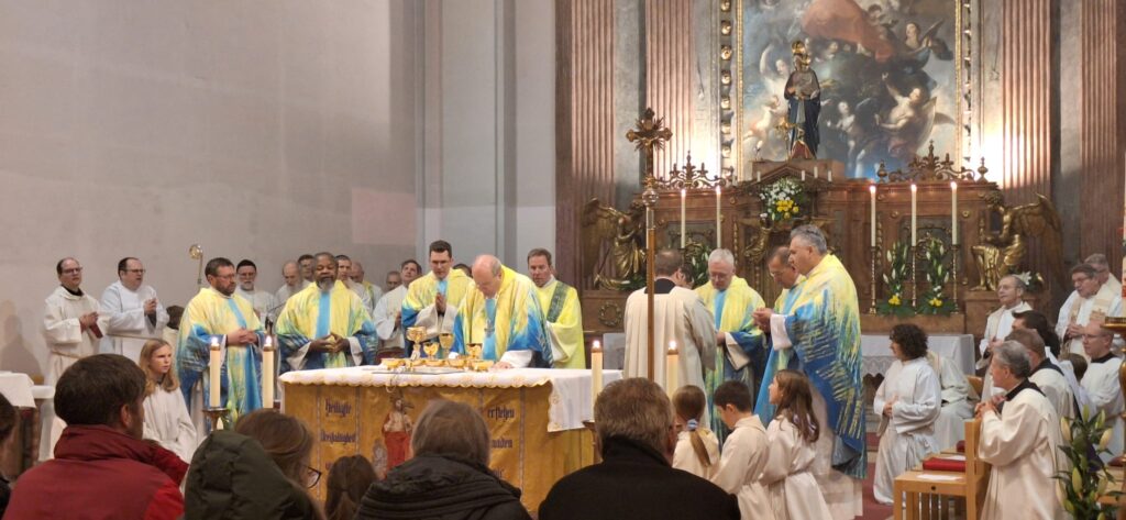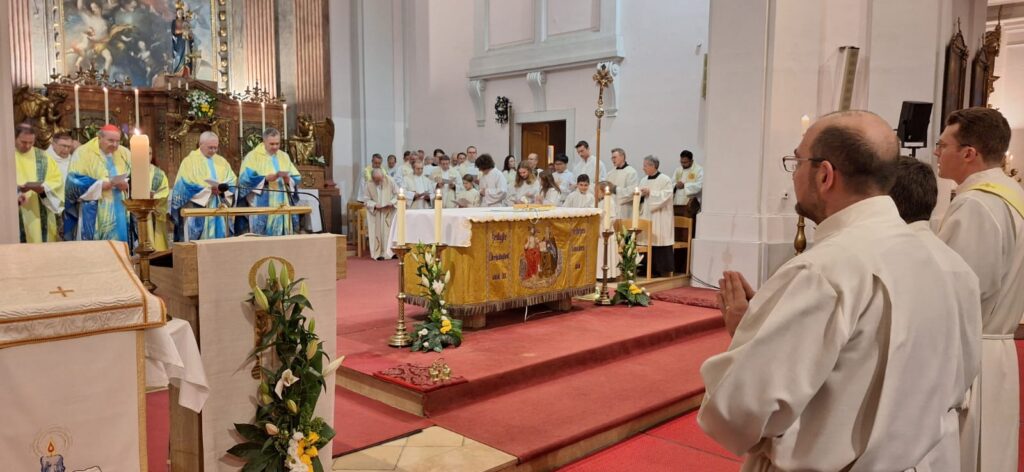 Am Vorabend des Christkönigsfestes, am Samstag 22. November, durften wir ein freudiges Ereignis in unserer Gemeinschaft feiern: Christoph Kardinal Schönborn, emeritierter Erzbischof von Wien, spendete unserem Mitbruder P. Bernhard Schwarz in der Pfarrkirche Reindorf die Priesterweihe. Fast alle Mitbrüder aus unserer Gemeinschaft sowie zahlreiche weitere Priester waren bei der Feier mit dabei, die Kirche in Reindorf war bis auf den letzten Platz gefüllt.